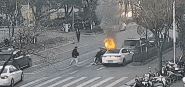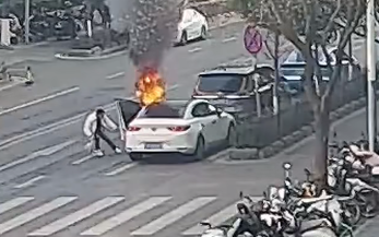 停在路边的一辆白色轿车突然起火