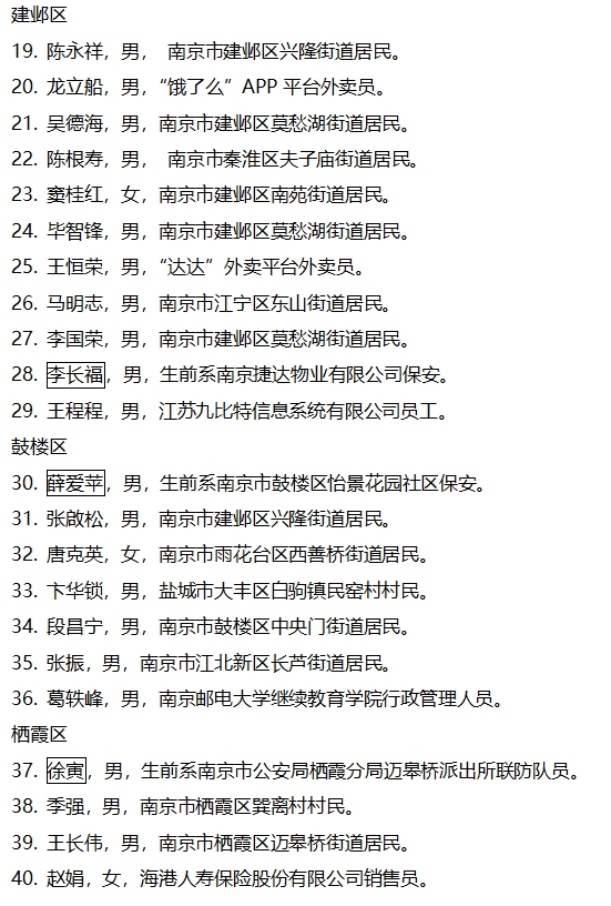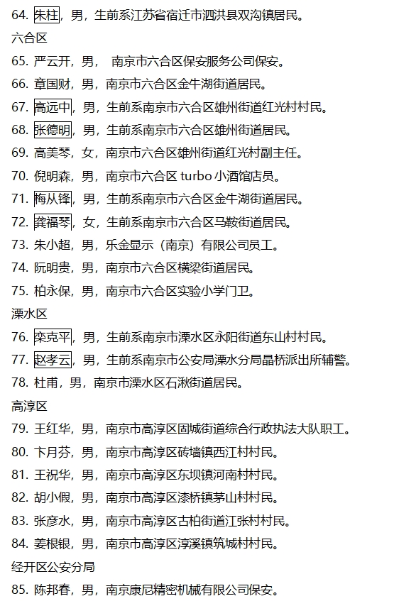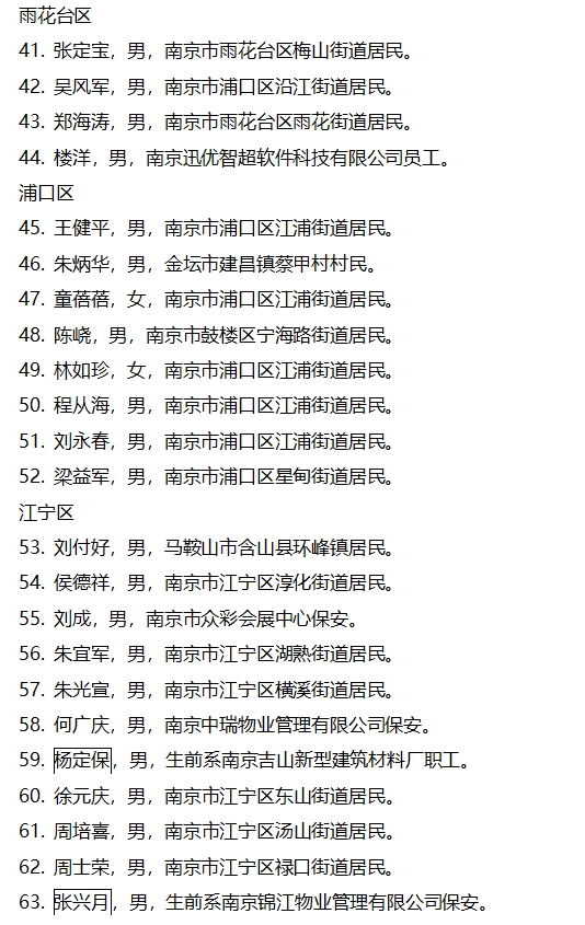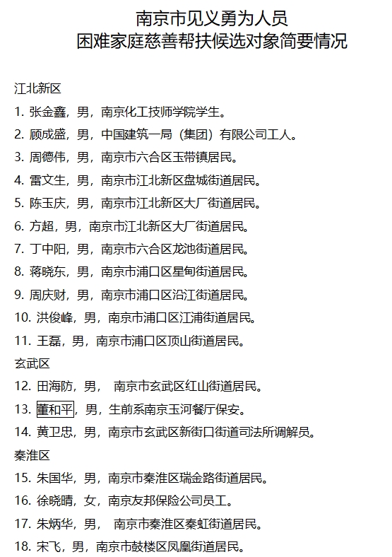 为了进一步弘扬社会正气,倡导见义勇为,广泛动员社会各界慈善力量,汇聚人民群众爱心,共同参与慈善帮扶见义勇为人员困难家庭,让他们充分感受到党委政府的温暖和社会各界的关心,南京市见义勇为基金会、南京市慈善总会联合开展见义勇为人员困难家庭慈善帮扶项目。按照资助范围、资助条件和程序要求,经各区见义勇为基金会、相关公安分局推荐上报,市见义勇为基金会、市慈善总会共同研究审议,提出候选对象名单。本着公平、公开、公正的原则,现将候选对象名单进行公示。本次公示时间为2024年10月15日至10月21日,如对候选对象有意见,请于2024年10月21日前向市见义勇为基金会反映。联系电话:025-84420070;地址:南京市秦淮区洪公祠1号市见义勇为基金会办公室。