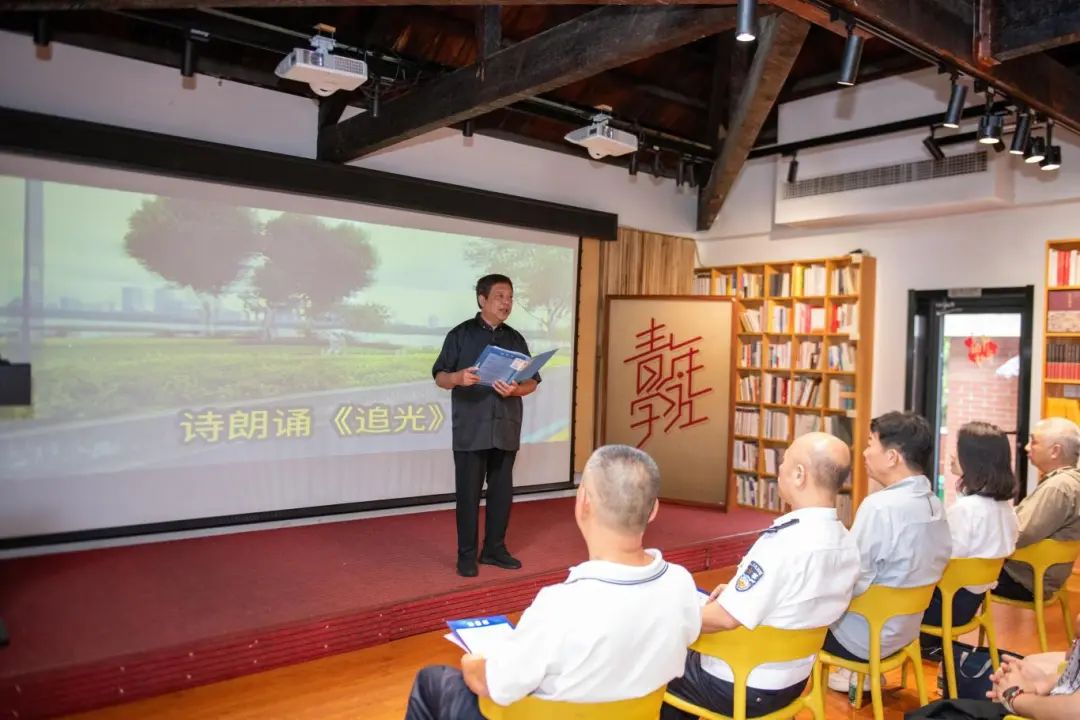 梅园新村街道退休老干部深情朗诵缅怀见义勇为烈士周光裕的现代诗《追光》,激励大家追逐光、成为光、散发光,将活动推向高潮。