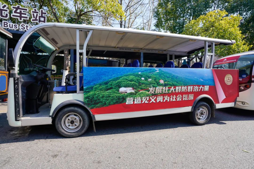 首批8辆观光车车身两侧设有融合了景区风光与见义勇为主题宣传的图文,车内以“见义勇为知多少”的问答形式对《南京市奖励和保护见义勇为人员条例》进行了宣传普及,主要内容涉及见义勇为申报条件、见义勇为人员优抚政策等。车辆行驶过程中,还将结合站点播报进行见义勇为宣传。