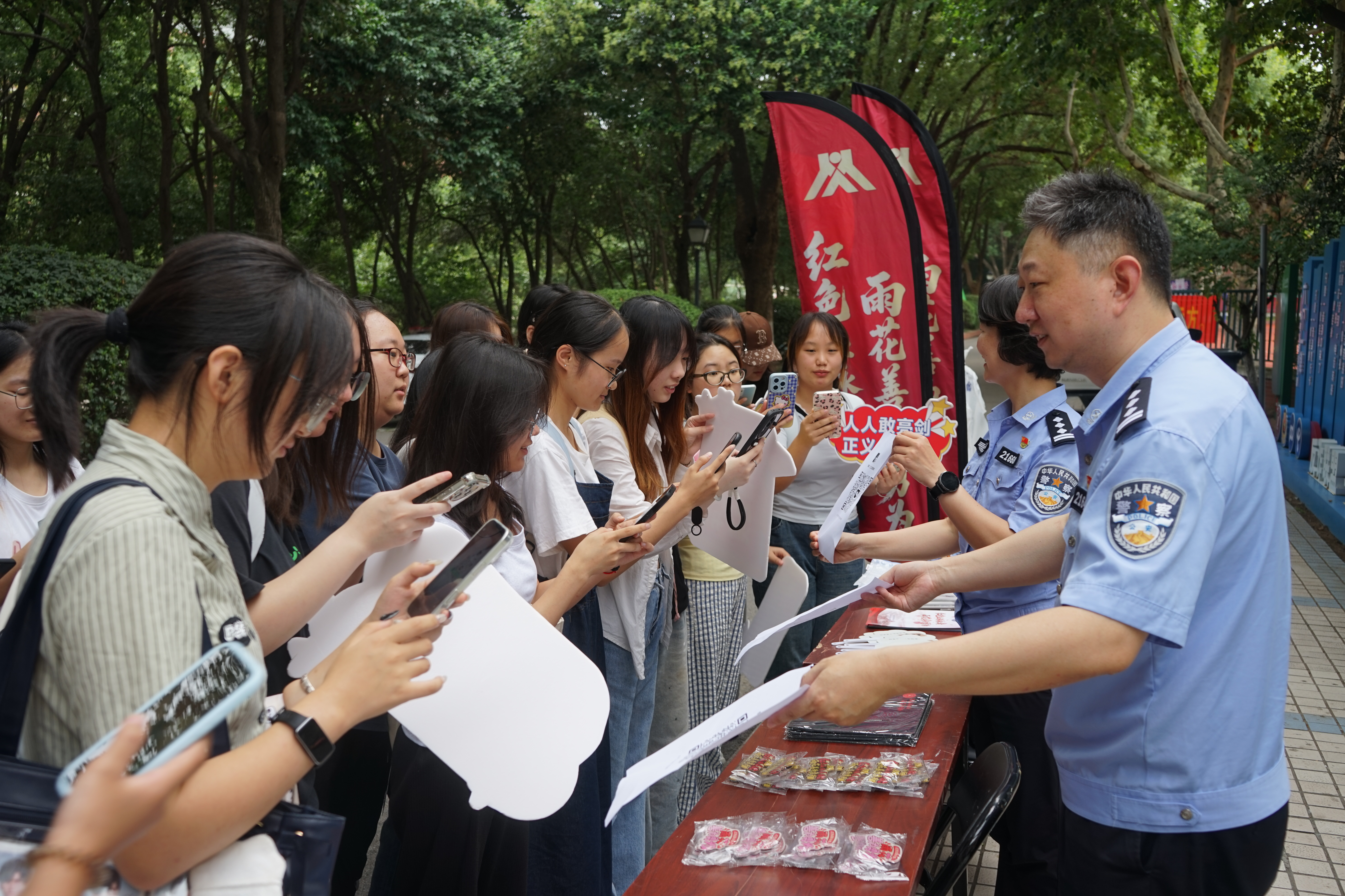 9月11日,由南京市公安局雨花台分局、南京市雨花台区见义勇为基金会联合举办的"义青春·正能量"见义勇为专题宣传活动在高校开学季火热开展。活动通过"文创引流+专题讲座+志愿招募"的创新模式,为大学新生带来了一场别开生面的"见义勇为第一课",现场共发放宣传品500余件,动员在校大学生200余名,成功招募雨花"义"员志愿者130余名。
