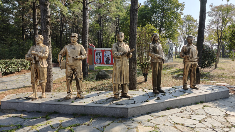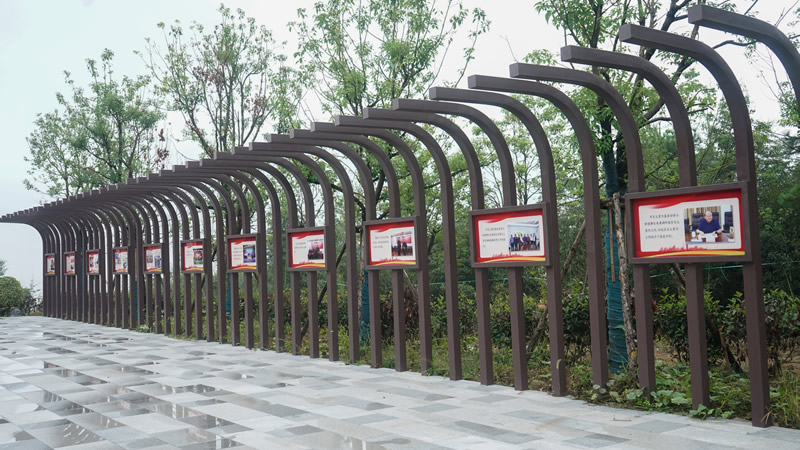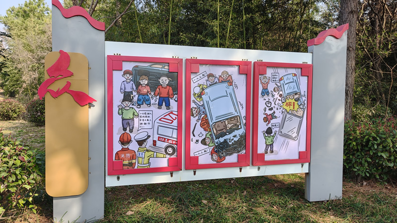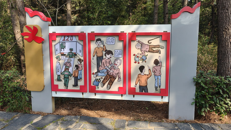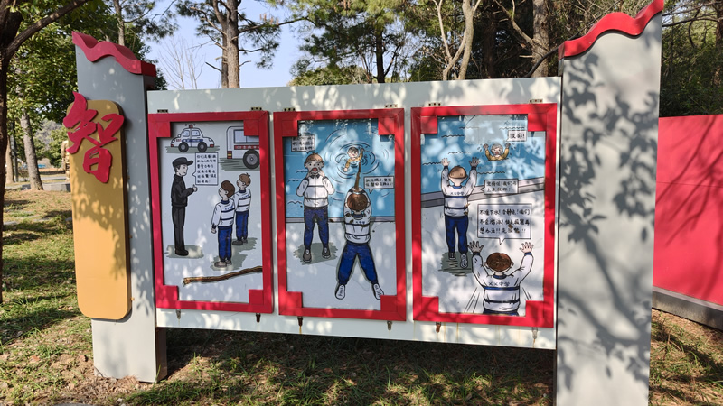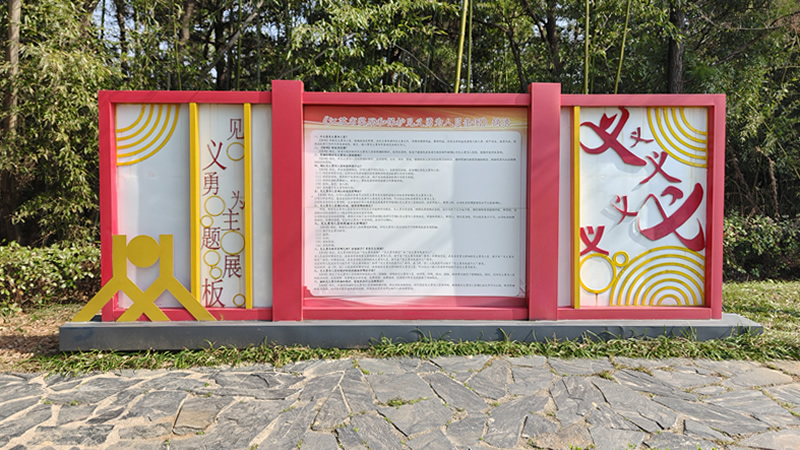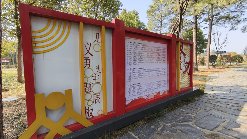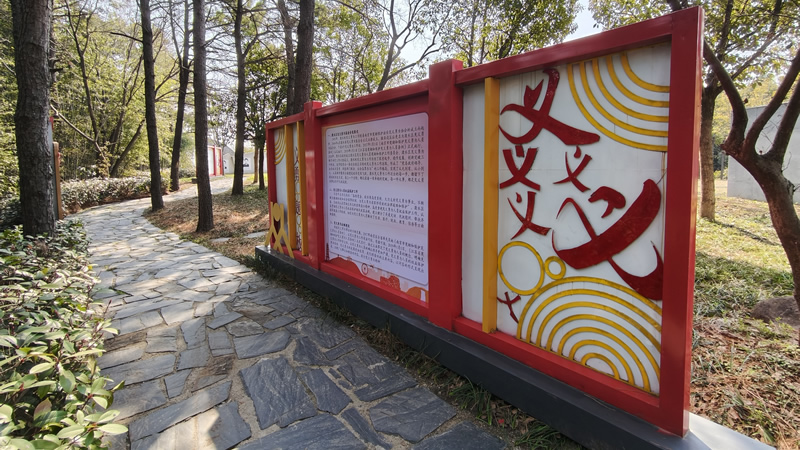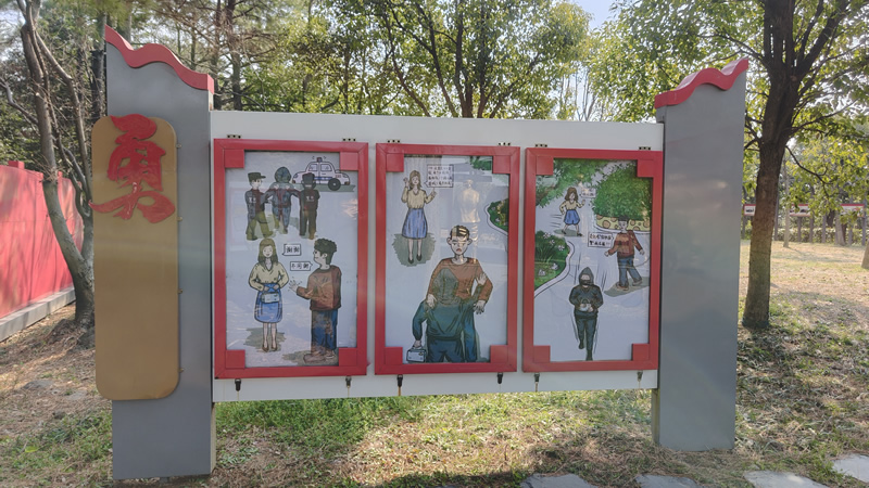 密林休闲区,以松树林为背景,林中布置以“义、勇、智、众”为主题的见义勇为事迹展板,设置休闲节点供学习参观人群提供思考休憩的静谧场所,在出口处以农民、工人、快递小哥等人物形象设置了见义勇为人物雕塑群,弘场见义勇为宝,激励更多的人投身见义勇为事业。