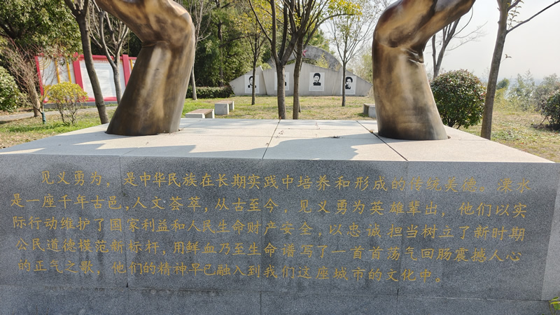 溧水区见义勇为主题广场位于大金山国防园园内东南角,广场占地面积约2300平方米,分为纪念广场区和密林休闲区两大功能区。
