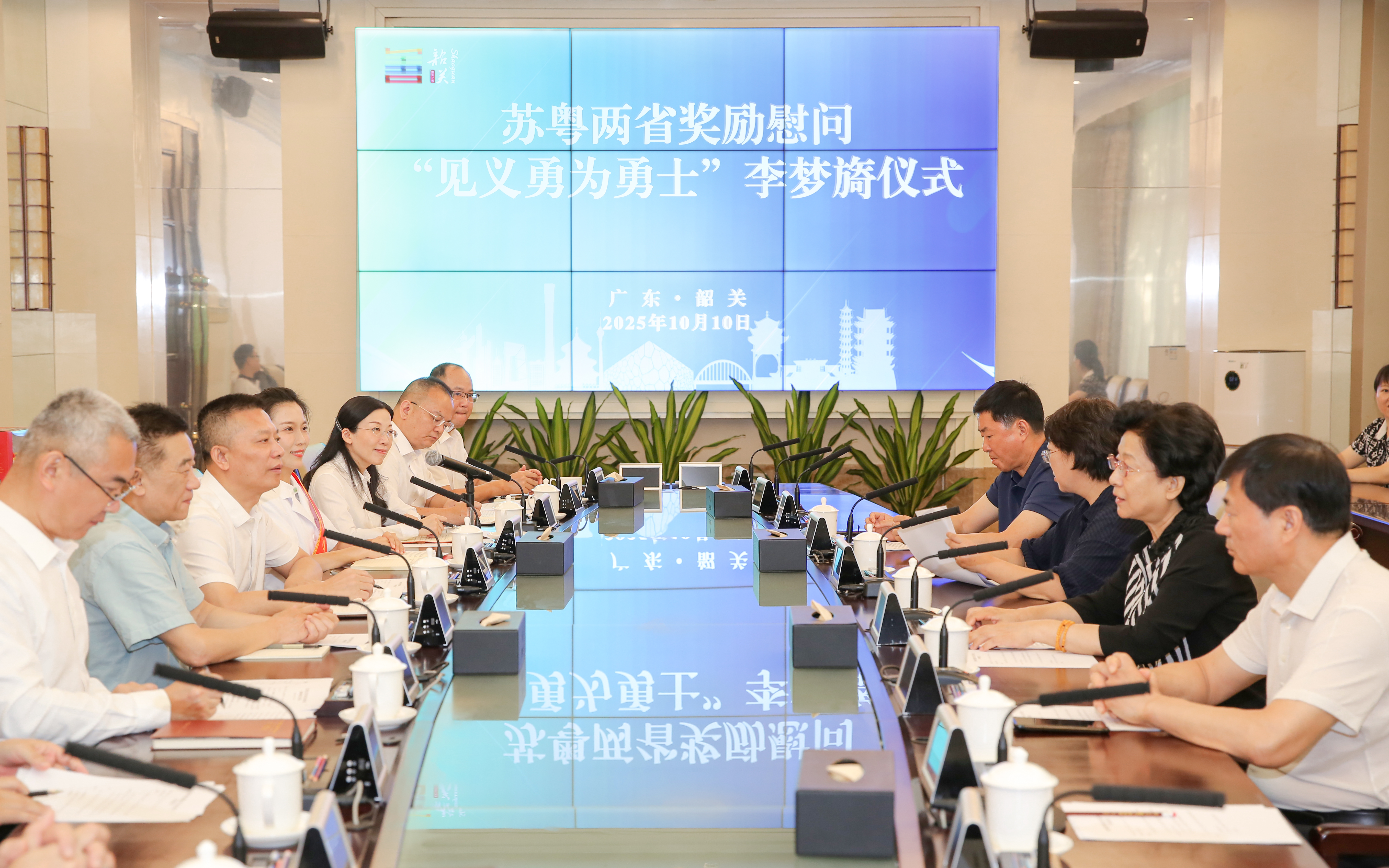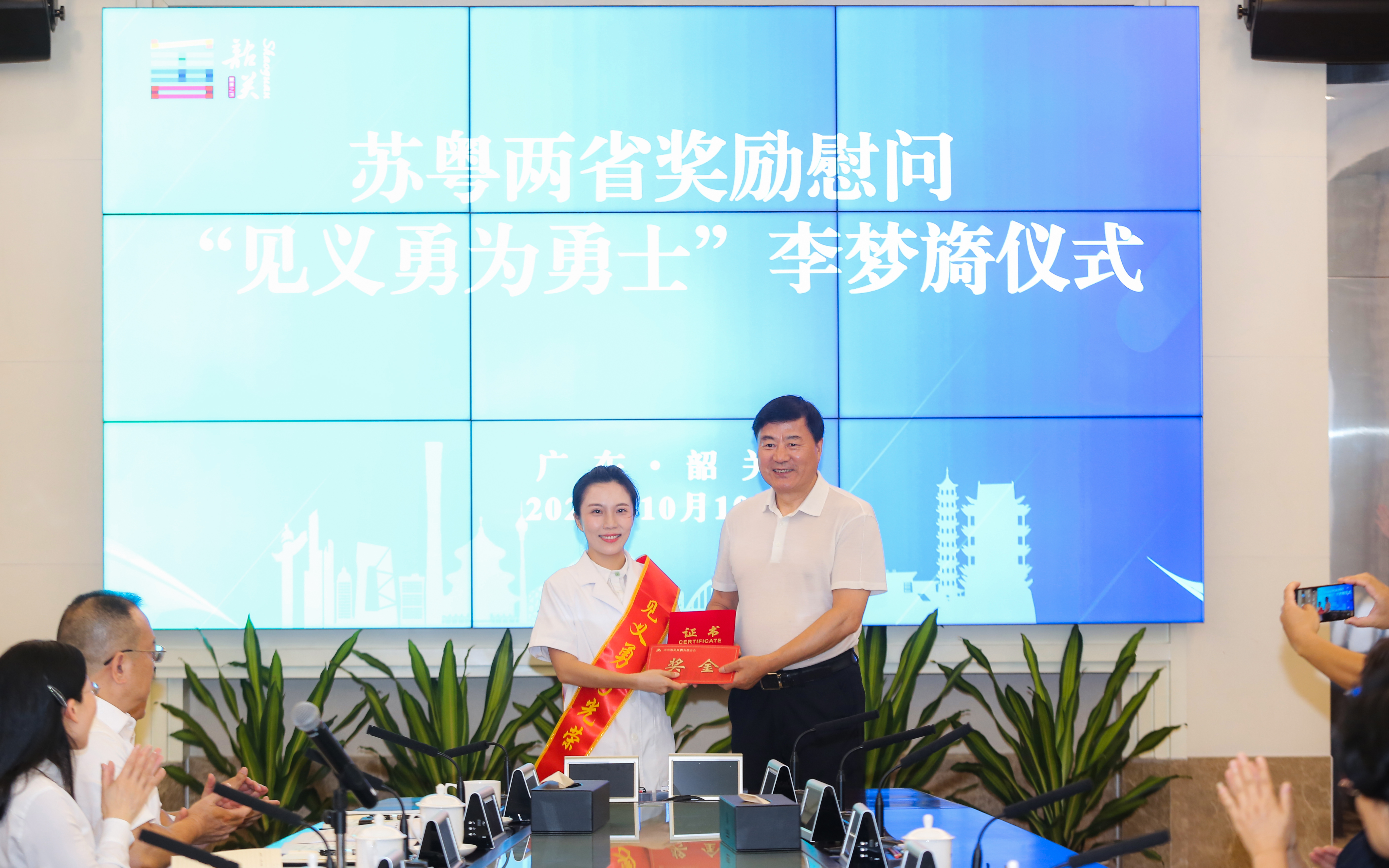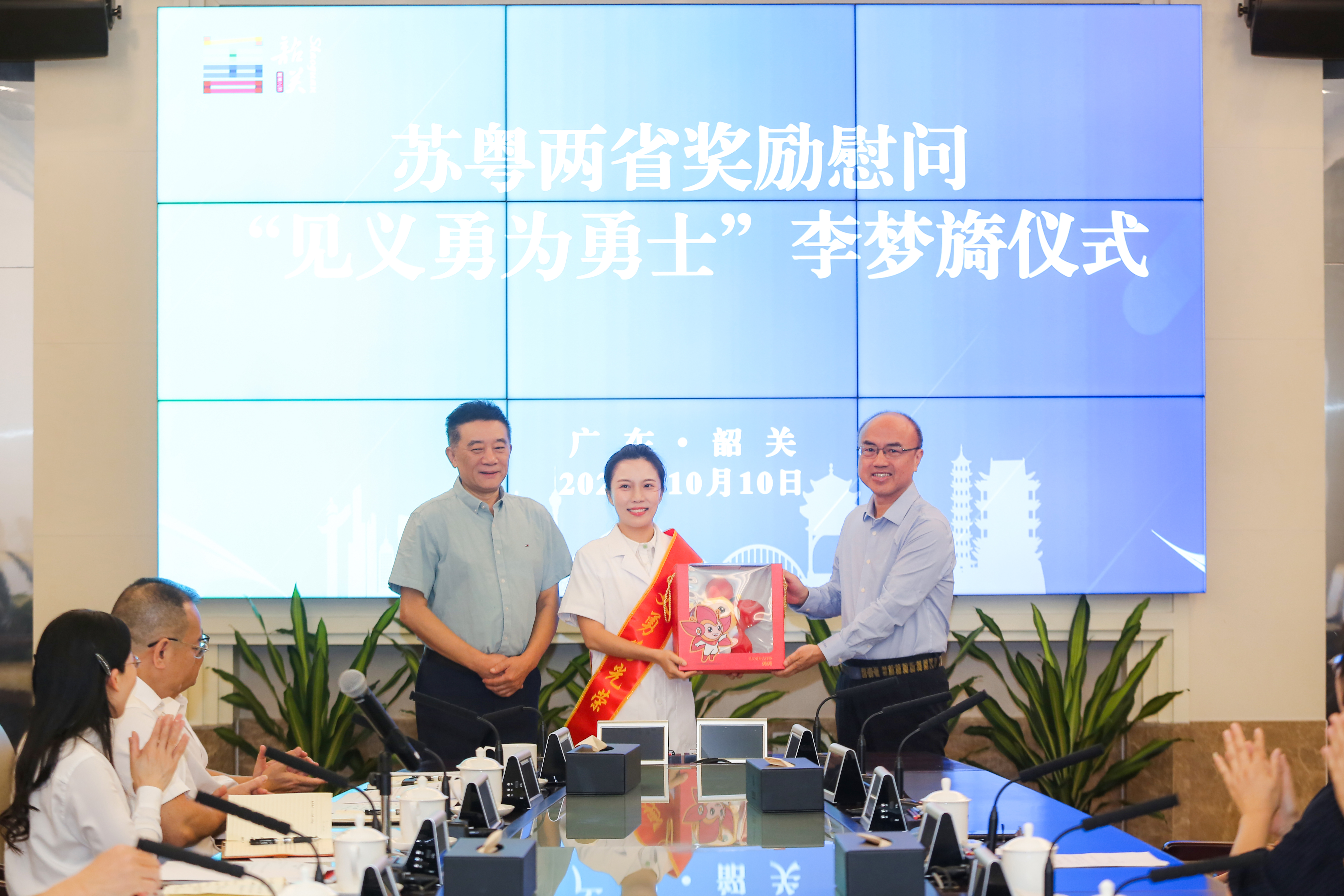 金秋十月,善美韶关。10月10日,江苏省见义勇为基金会理事长弘强、南京市见义勇为基金会理事长孙建友和广东省见义勇为基金会理事长李京,在广东韶关看望慰问2025年第二、三季度“全国见义勇为勇士”和第三季度“江苏省见义勇为勇士”李梦旖同志,分别向她颁发证书、慰问金和纪念品。广东省韶关市委常委、政法委书记李泽航,广东省韶关市副市长、公安局长张岩参加慰问活动。