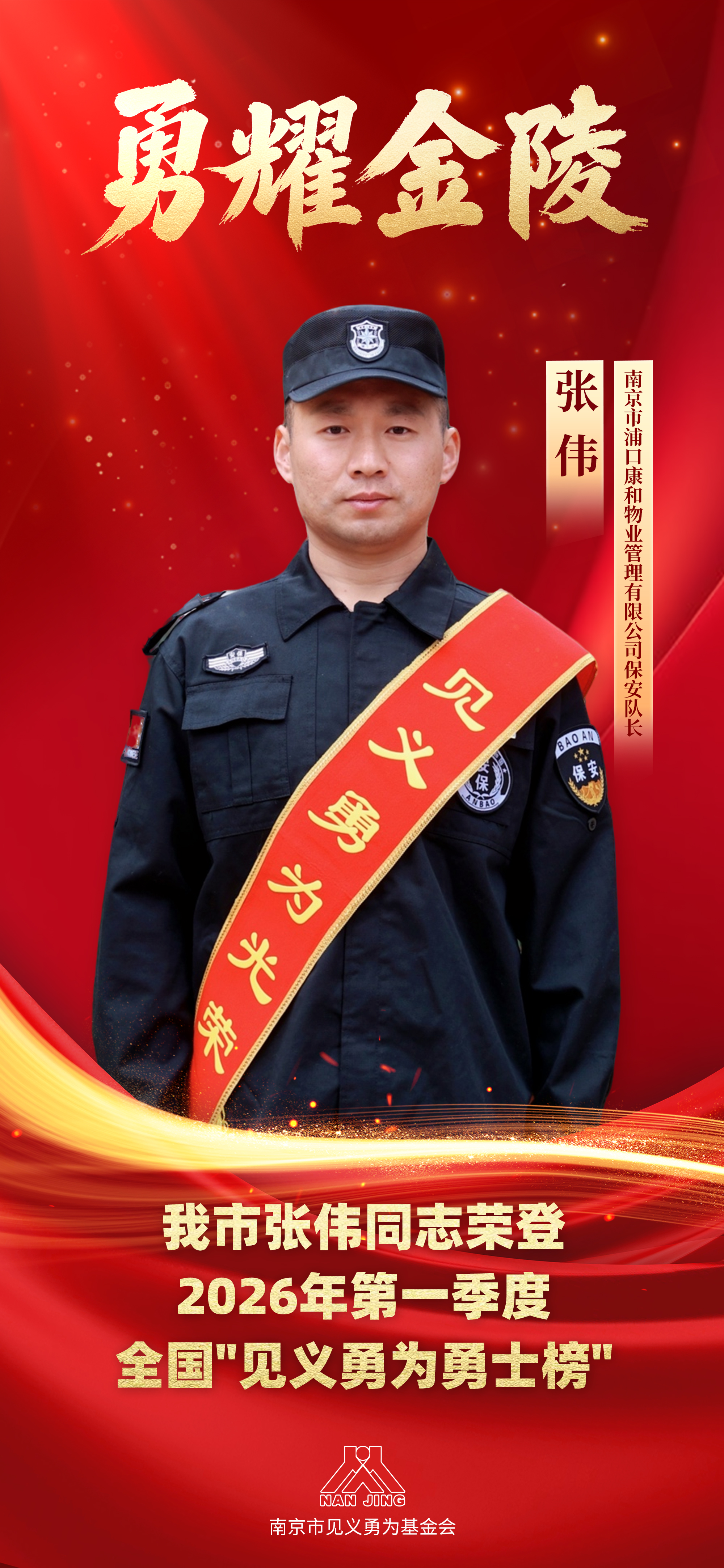 3月30日,中央政法委发布2026年第一季度全国“见义勇为勇士榜”, 我市见义勇为人员、浦口康和物业管理有限公司保安队长张伟同志光荣登榜。