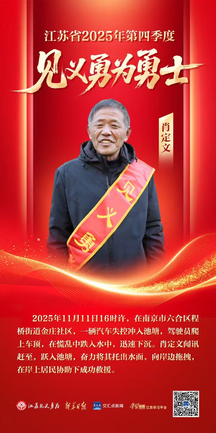 2025年,南京市共有4名见义勇为人员入选“江苏见义勇为勇士”。他们中有人从燃烧车辆中救出被困司机,有人运用专业知识救助发病群众,在一个又一个生死瞬间挺身而出,以行动生动诠释见义勇为精神,传递了社会正能量与融融暖意。
